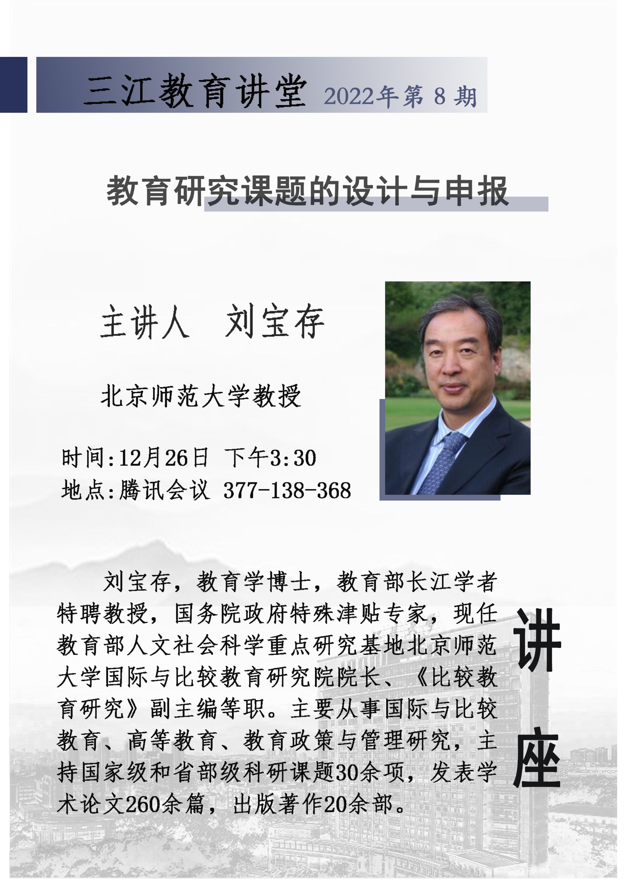 上一条:2021级非全日制教育硕士研究生开题结果公示(第一批) 下一条:三江教育讲堂(第7期):经典阅读与研究生学术成长(魏峰教授)