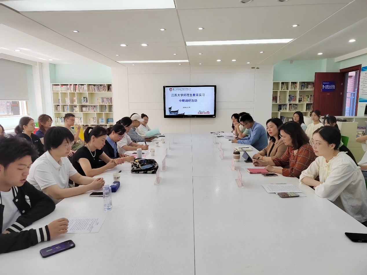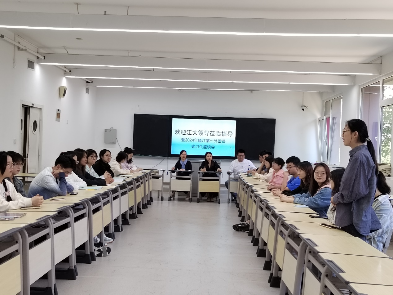 镇江市外国语学校西津渡校区副校长张雪琴、教务主任肖剑、信息处主任吴艳和中学教师代表、全体实习生与康翠一行开展座谈。双方就师范生联合培养、师范生教学基本功锻炼和中学人才招聘等方面进行交流。座谈后,91暗网 指导教师邓晓燕、庞伟奇、黄湛与所指导的实习生进行单独交流。
